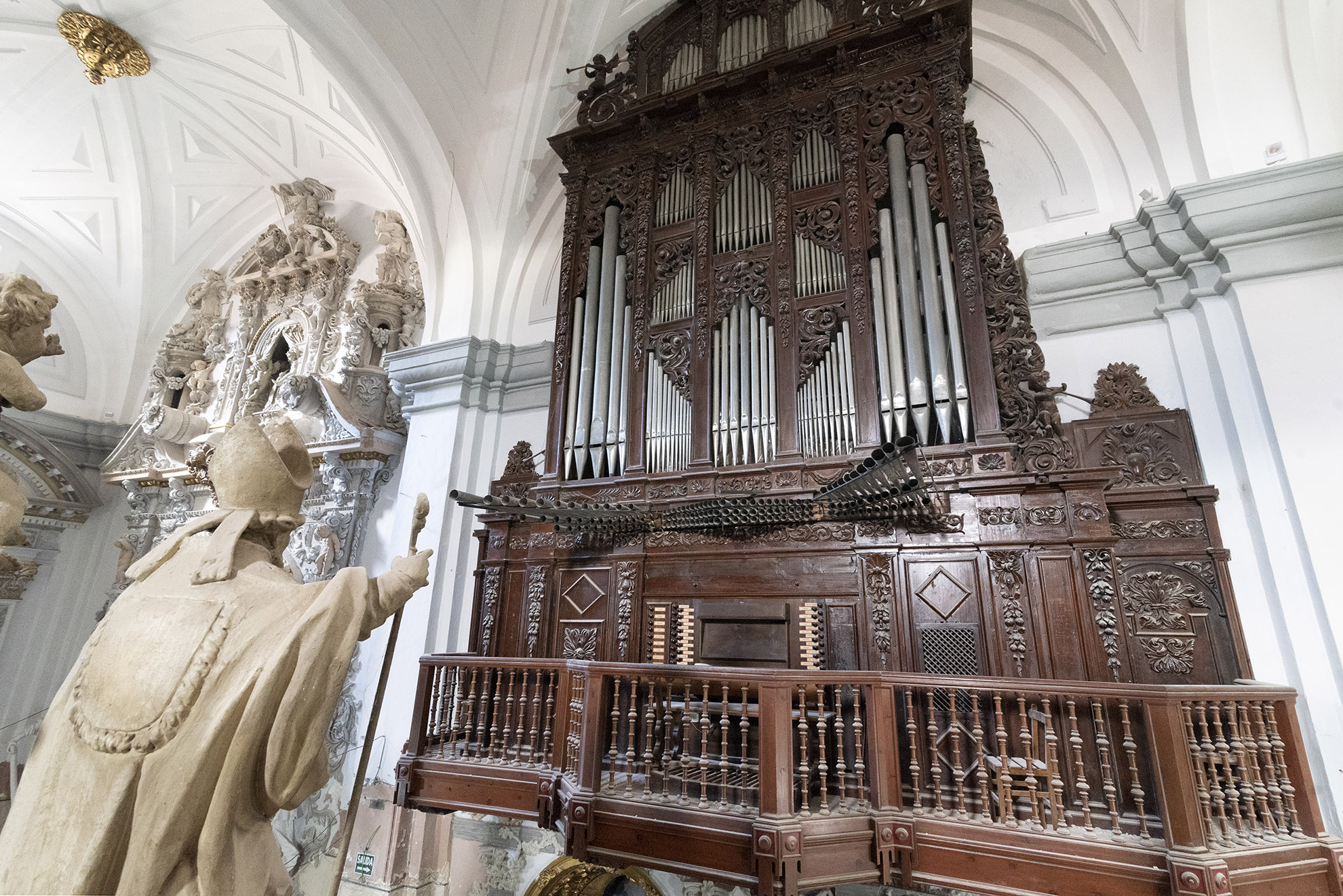 La primera planta está formada por una amplia sala dividida en dos tramos por un arco fajón apuntado que apea en ménsulas; ambos tramos se cubren con bóvedas de crucería sencilla. La sala se ilumina por medio de dos ventanales geminados en arco apuntado. Presenta un acceso tapiado que comunicaba con el edificio anexo adosado a la antigua muralla; el único acceso en uso es una puerta en arco ligeramente apuntado que comunica con el coro de la iglesia, a través de una escalera de caracol que atraviesa la escalera que conduce al campanario.